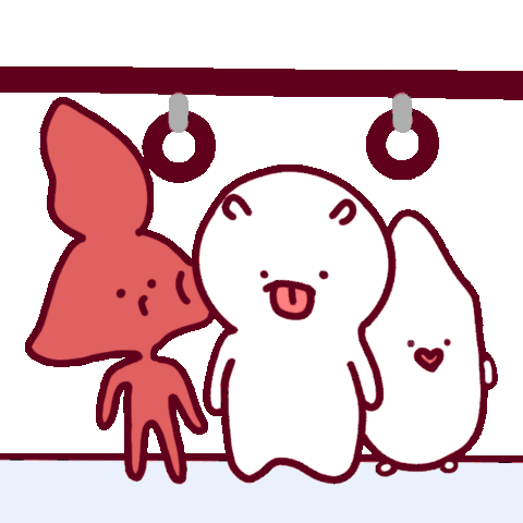 Three cartoon characters, one red and two white, look squished and uncomfortable while commuting on a crowded public transport vehicle.