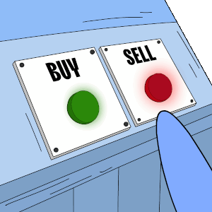 A stressed Pudgy Penguin faces a tough decision between pressing the green 'BUY' or red 'SELL' button.