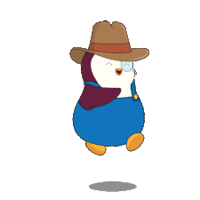 A cheerful Pudgy Penguin farmer, wearing overalls and a hat, hops happily next to a large orange pumpkin.