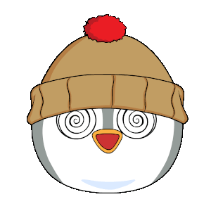 A Pudgy Penguin character with dizzy, spiral eyes, wearing a brown beanie with a red pom-pom, appearing confused or hypnotized.