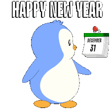 A cute Pudgy Penguin celebrates the New Year, holding a calendar showing January 1st, with 'HAPPY NEW YEAR' text.