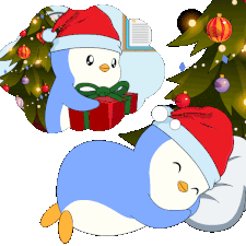 A cute Pudgy Penguin in a Santa hat sleeps, dreaming of Christmas gifts and financial success.