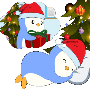 A cute Pudgy Penguin in a Santa hat dreams of receiving a Christmas gift, surrounded by festive cheer.