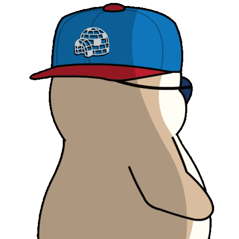 A cute Pudgy Penguin wearing a cap and eyepatch looks around confused, expressing bewilderment.