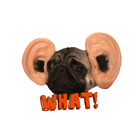 A confused pug dog with oversized fake ears looks surprised, accompanied by the bold text 'WHAT!' below it.