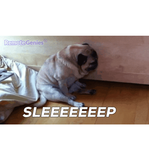 A tired pug dog sits slumped against a wall, with the caption 'SLEEEEEEEP' indicating its deep desire for rest.