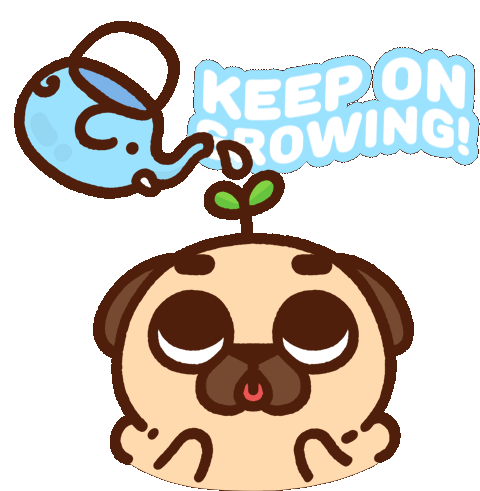 Puglie Pug with a sprout on its head being watered by a watering can, encouraging growth.