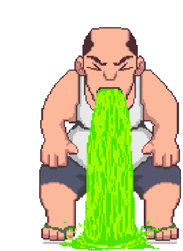 A pixel art bald man in a tank top squats and vomits a stream of bright green liquid, showing discomfort.