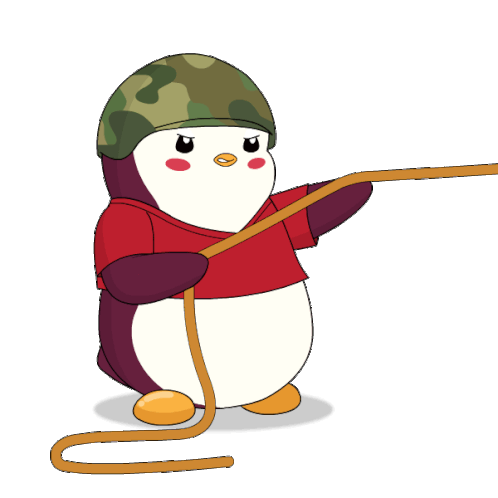 A cute pudgy penguin in a camouflage helmet and red shirt strains to pull a thick rope, showing great effort.