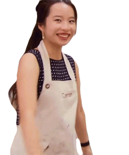 Caron Lau, from The Great Canadian Baking Show, smiles brightly and makes a pumped gesture, full of happy energy.