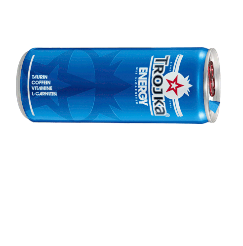 A blue Trojka Energy drink can pours out a stream of blue liquid, symbolizing a boost of energy and charge.