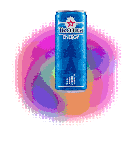 Vibrant Trojka Energy drink can rotating on a dynamic, swirling rainbow-colored background, showcasing its energizing appeal.