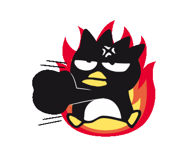 Badtz Maru, the angry black penguin, surrounded by fire, throws a powerful punch.