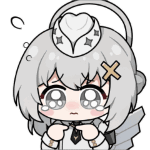 Chibi girl from Punishing Gray Raven looking worried with tears, a heart headpiece, and a cross on her forehead.