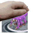 a person is holding a purple toy monkey on a table .