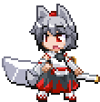 Momiji Inubashiri from Touhou in a pixel art stance, a fierce wolf-girl with a sword.