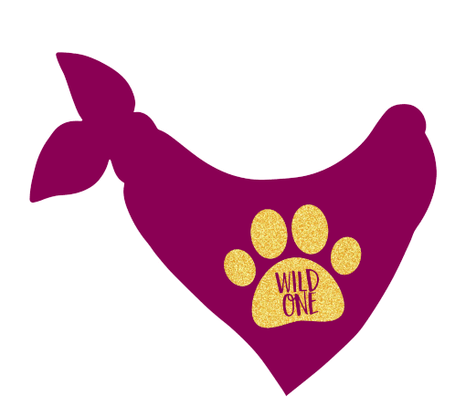 A vibrant purple Puppytalesphotos dog bandana featuring a glittery gold paw print with "WILD ONE" text.