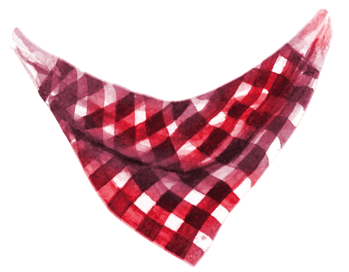 A vibrant watercolor illustration of a red and white checkered bandana, associated with Puppytalesphotos.
