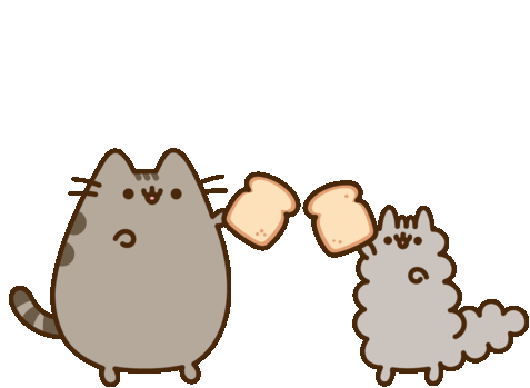 Pusheen and a fluffy friend happily clink slices of toast together, celebrating with their favorite snack.