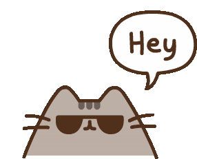 Pusheen Kitty with cool sunglasses peeks up and says 'Hey' in a speech bubble, a casual greeting.