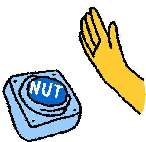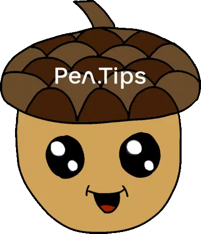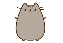 Pusheen-themed animated sticker of a brown acorn with the words 'look he's' appearing and disappearing.