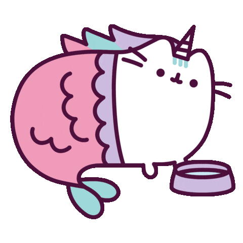 Animated Pusheen the cat as a magical mermaid unicorn, happily drinking from a bowl. Cute and whimsical.
