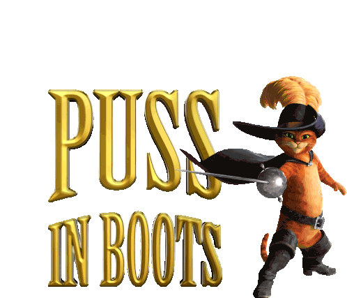 Puss In Boots, the swashbuckling feline hero, stands ready with his rapier beside the golden 'PUSS IN BOOTS' logo.