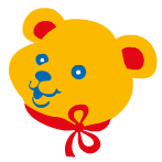 Pustebär, the cheerful yellow bear, winks and smiles, adorned with a red bow, ready for fun and soap bubbles.