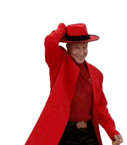 Simon Pryce, dressed in a vibrant red suit and fedora, dances cheerfully while tipping his hat and pointing.
