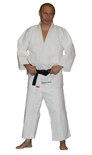 a man wearing a white karate uniform with vladimir putin embroidered on his chest