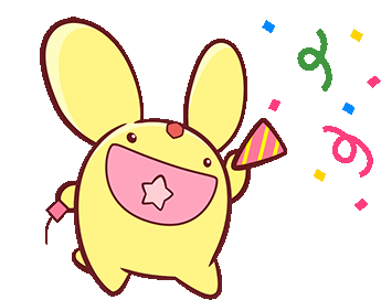 Carbuncle from Puyo Puyo celebrates with a party popper, releasing colorful confetti and streamers. Express joy and excitement.