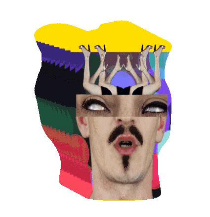 A surreal animated collage featuring a man's face with wide eyes, topped by multiple pairs of upside-down female legs, against a vibrant, shifting abstract background.