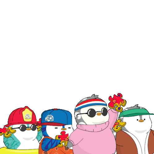 A group of adorable Pudgy Penguins, each wearing unique hats and sunglasses, holding colorful puzzle pieces.