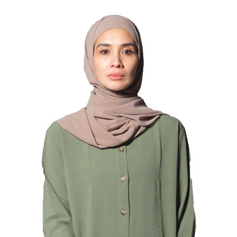 A woman in a hijab makes a thoughtful 'Hmm' expression, touching her chin, perfect for moments of contemplation or suspicion.