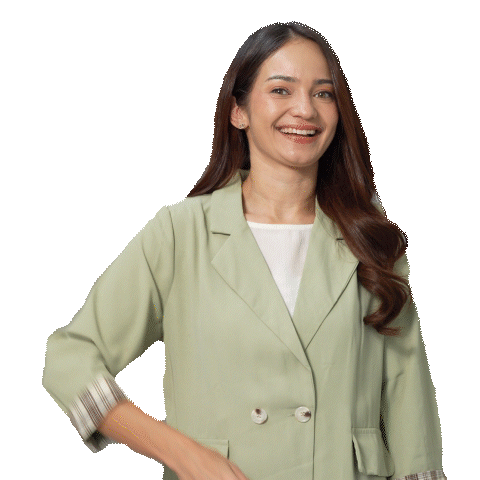 A smiling woman in a green jacket gives a thumbs up with the Indonesian caption "Baiklah!" (Alright!), conveying approval.