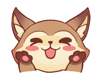 A cute Qmeng fox character wiggles happily with a wide smile and tongue out, expressing excitement.