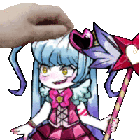 Qoh, the character from Lobotomy Corporation, gently interacts with her fluffy pet using a glowing wand.