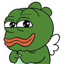 A cute Qoo Pepe frog character with small white wings and a mischievous smile, ready for playful interaction.