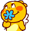 Qoobee, the adorable yellow cartoon character, happily smells a vibrant blue flower, showing various cute expressions.