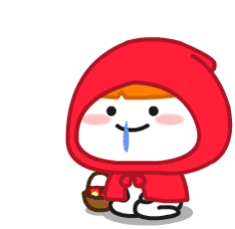 Quby, dressed as Little Red Riding Hood, smiles sweetly despite having a cold and a runny nose, holding a small basket.