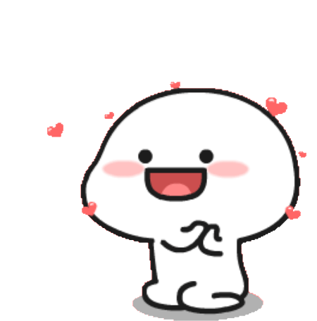 An adorable animated sticker of Quby Pentol with rosy cheeks and a wide smile, surrounded by floating red hearts, expressing love.