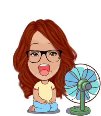 A cartoon woman with glasses and curly hair sits by a spinning fan, expressing discomfort from the heat, saying "Que Calor!".