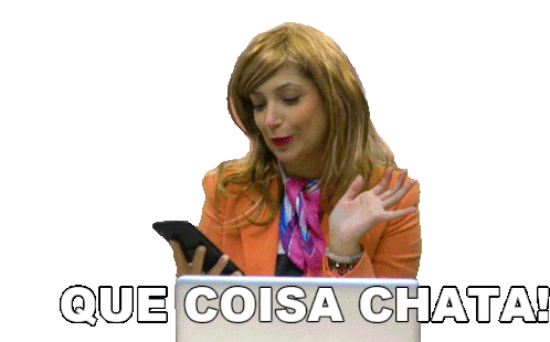A woman from Drelacionamentos expresses annoyance with 'Que Coisa Chata!' (How annoying!) while looking at a phone.
