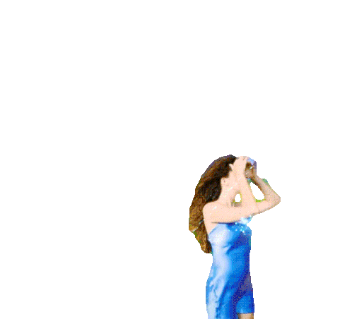 Dani looks up in surprise, hands near her head, as a mysterious light blue splash moves across the frame.