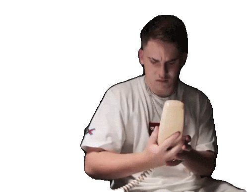 Juanfran looks utterly confused and slightly disgusted while holding an old phone receiver, expressing a "Que Extrano" sentiment.