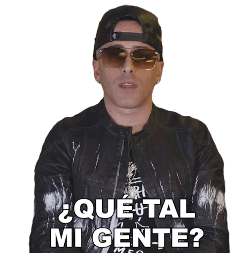 Yandel, wearing a cap and sunglasses, greets his audience with the iconic phrase '¿Qué tal mi gente?' in this animated sticker.