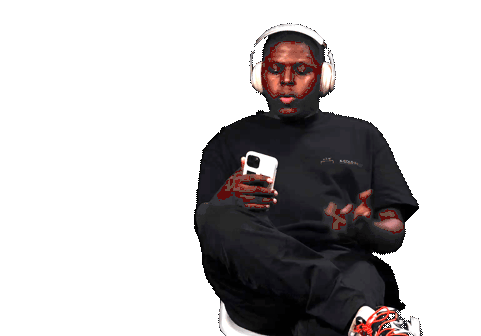 Que Wedontplaythesamegqom listens with headphones, engrossed in his phone, making expressive hand gestures.