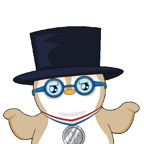 A pudgy penguin character in a top hat and glasses looks confused, shrugging as question marks appear around its head.