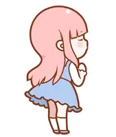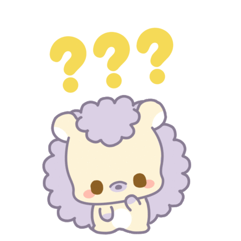 A cute, fluffy, light yellow animal with a large purple mane sits, looking with a curious or questioning expression.