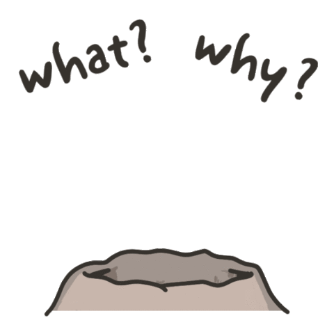 A cute mole pops out of its burrow, looking confused with rosy cheeks, asking "what?" and "why?".